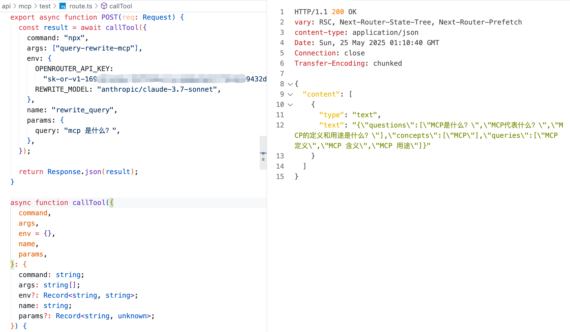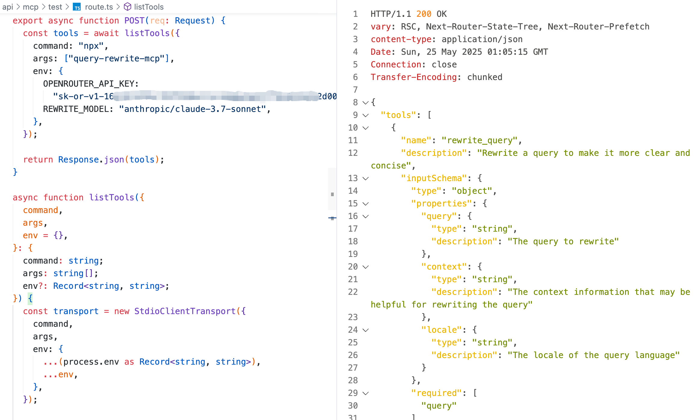 listTools函数,在 4.2 节已详细讲解其实现逻辑,本节内容不再赘述。调试此 MCP 服务器需要填写的OPENROUTER_API_KEY在 OpenRouter 平台获取;填写的REWRITE_MODEL是用于改写问题的模型,开发者可自行指定,但推荐使用claude系列模型,会有更好的改写效果。