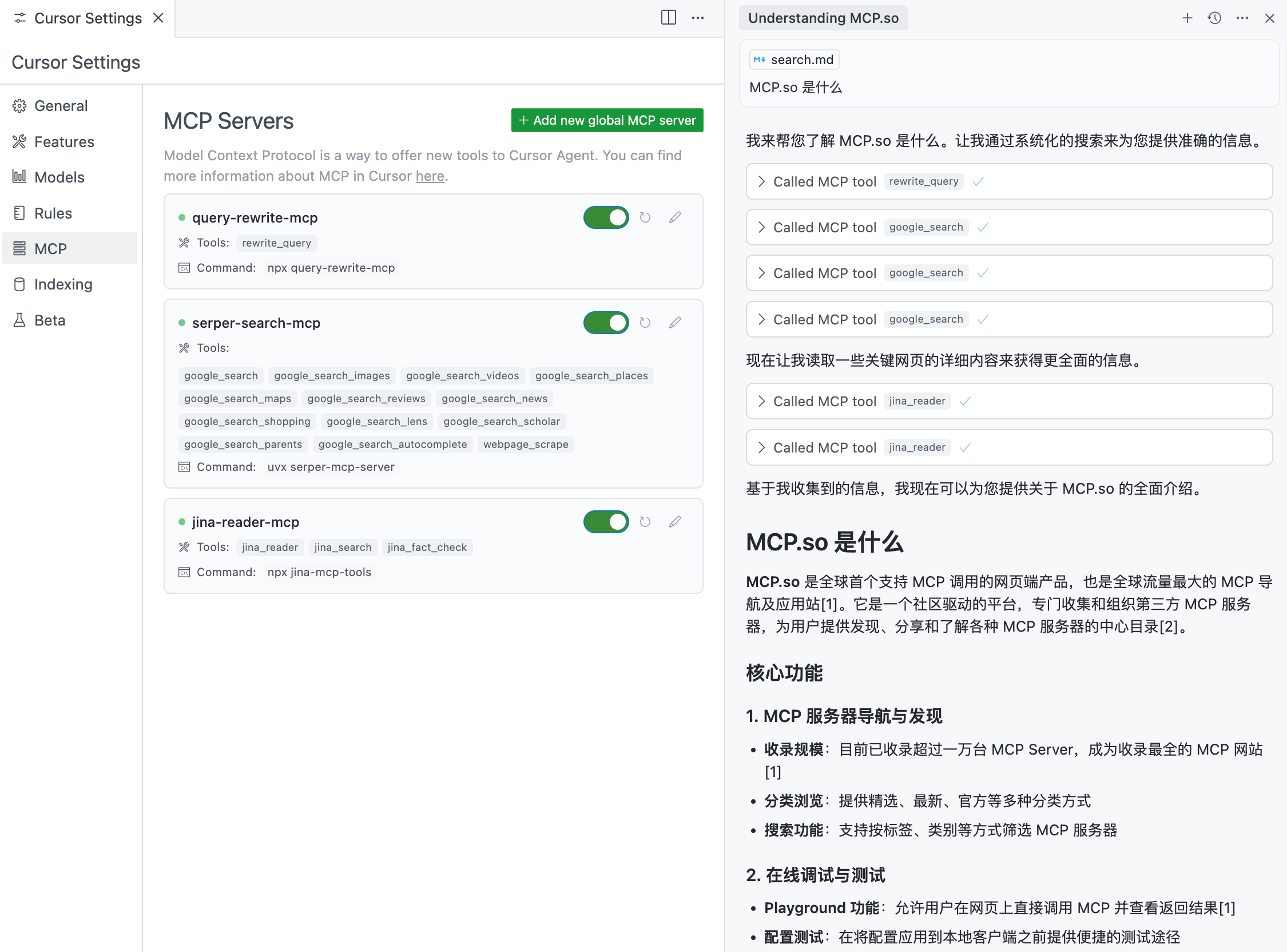 可以看到,Cursor 作为 MCP 客户端,按照提示词约定的工作流与大模型交互,先进行了一次问题改写,再进行了三次联网检索,最后读取了两个网页内容,最终回复查询问题,给出了准确的回答。