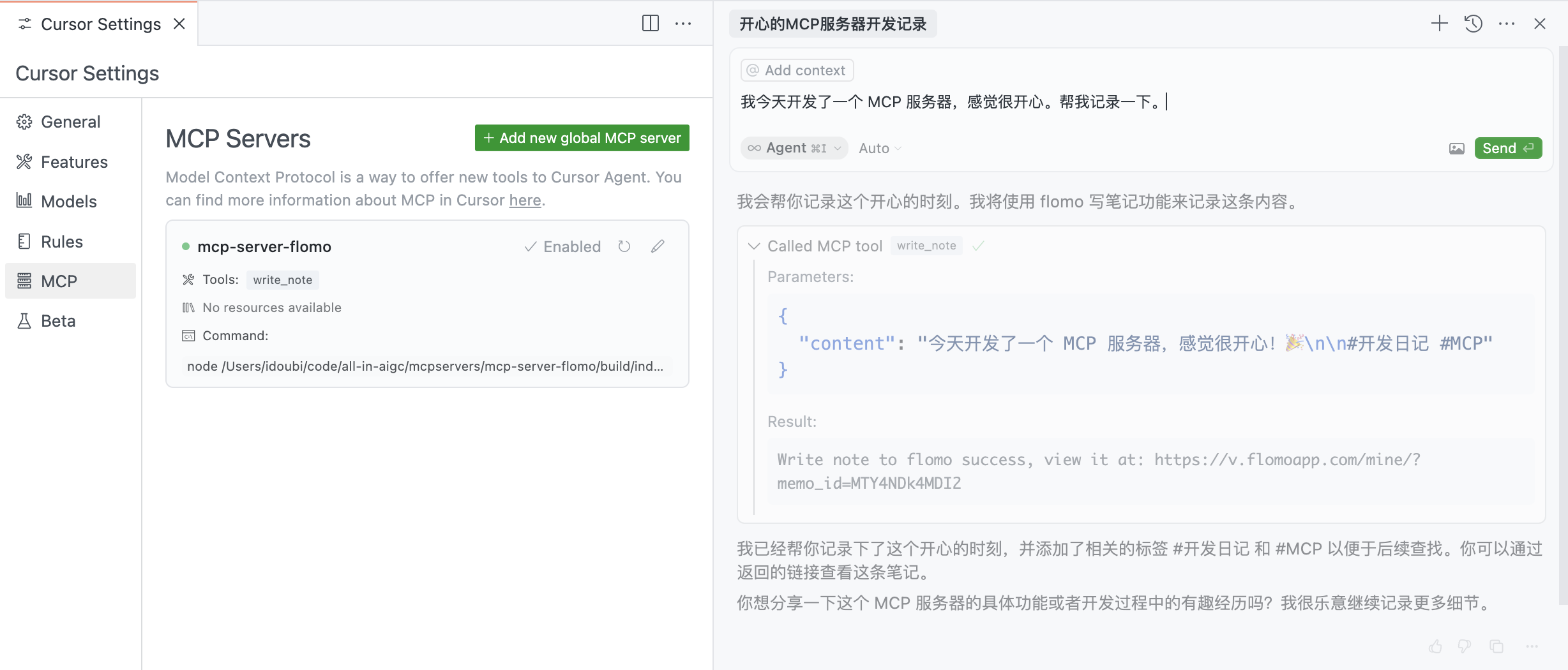 我今天开发了一个 MCP 服务器,感觉很开心。帮我记录一下。Cursor 会加载所有已配置的可用的 Tools 进行意图识别,识别到用户的意图是要记笔记,会自动调用 mcp-server-flomo 服务的 write_note 工具写入笔记。