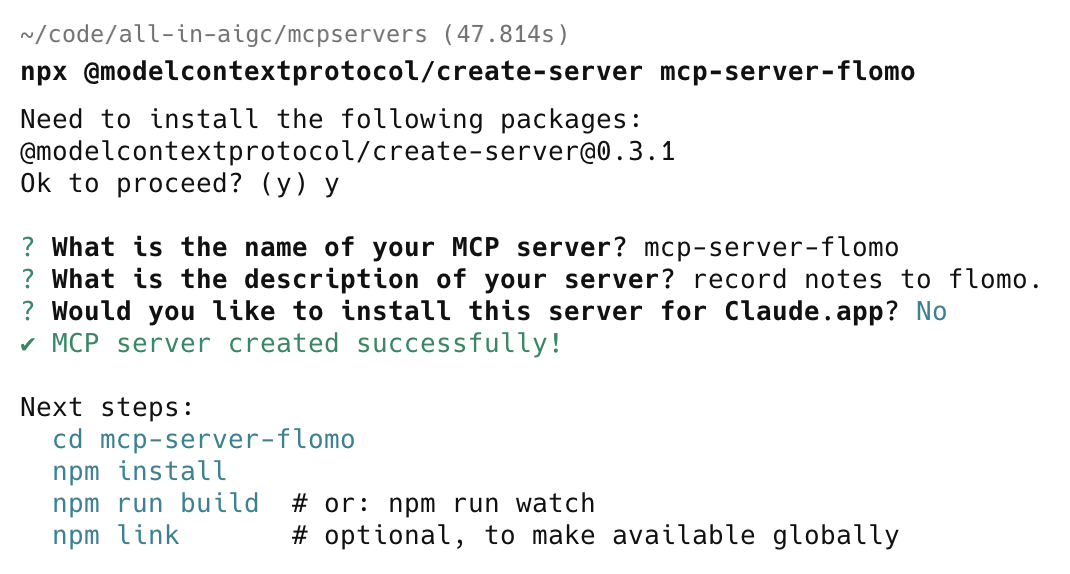 npx @modelcontextprotocol/create-server mcp-server-flomo在终端软件执行上面的命令,按照提示输入要创建的 MCP 服务器信息: