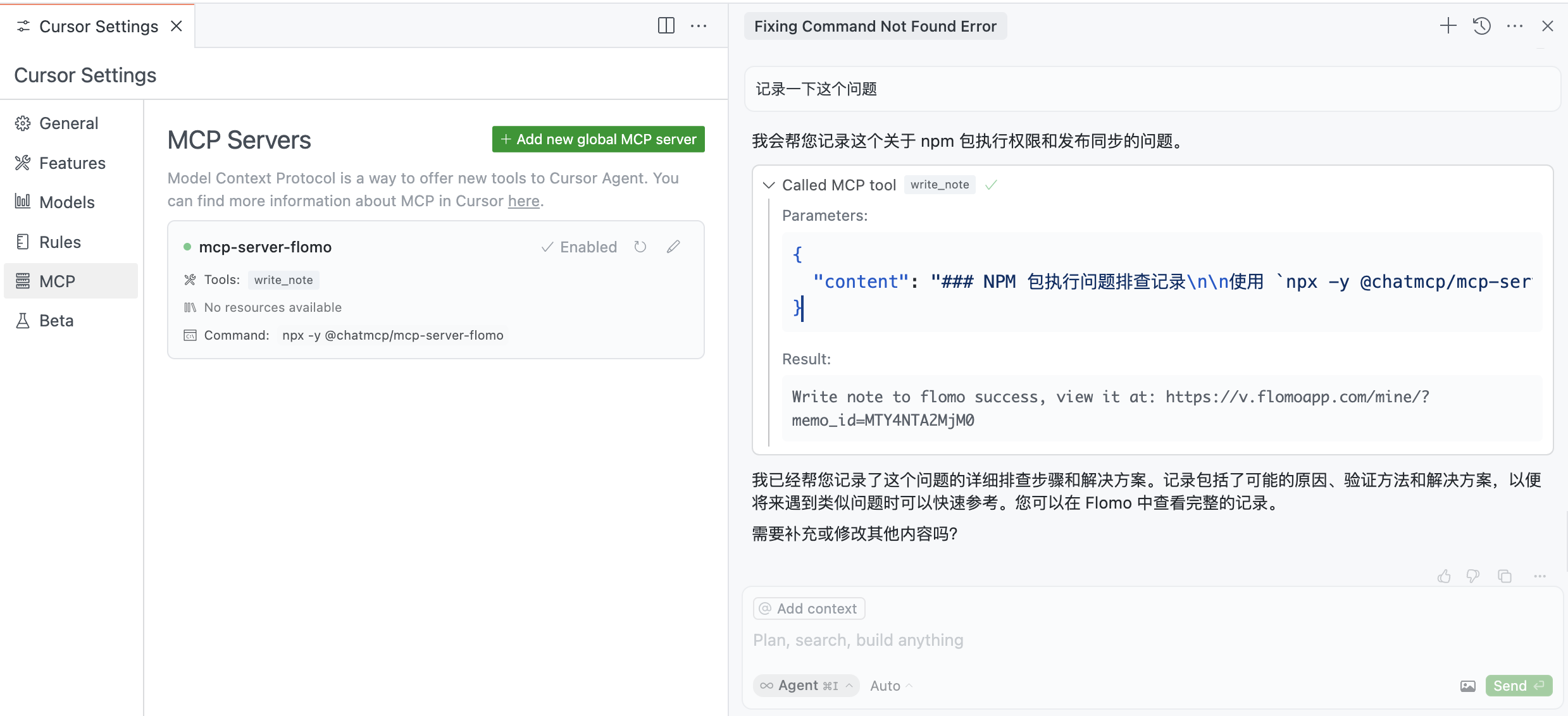{ "mcpServers": { "mcp-server-flomo": { "command": "npx", "args": ["-y", "@chatmcp/mcp-server-flomo"], "env": { "FLOMO_API_URL": "https://flomoapp.com/iwh/xxx/xxx/" } } }}在 MCP 客户端(比如 Cursor)继续测试,例如可以在利用 AI 解决某个问题之后,一键保存问题信息和解决办法到 Flomo: