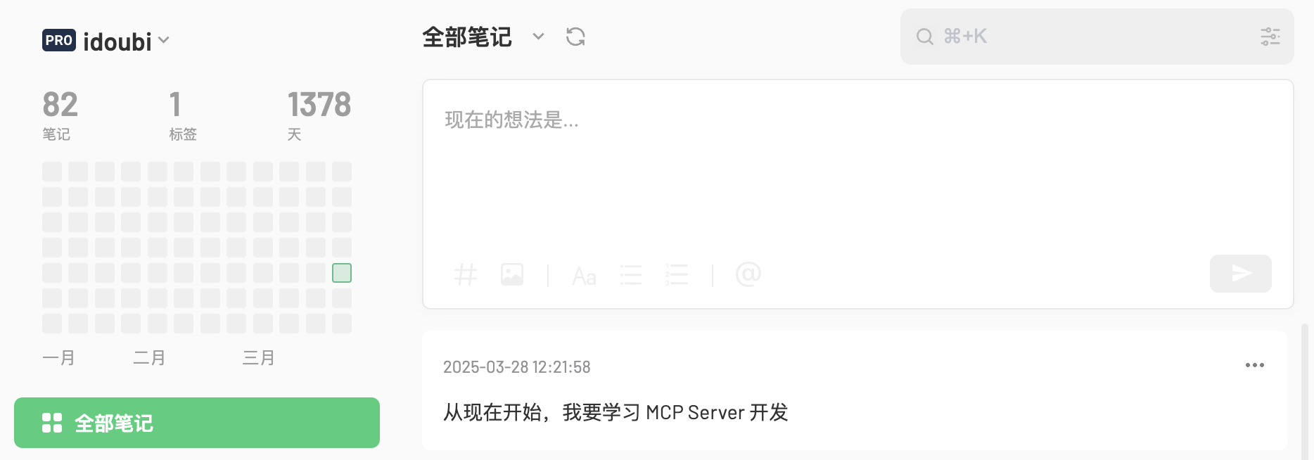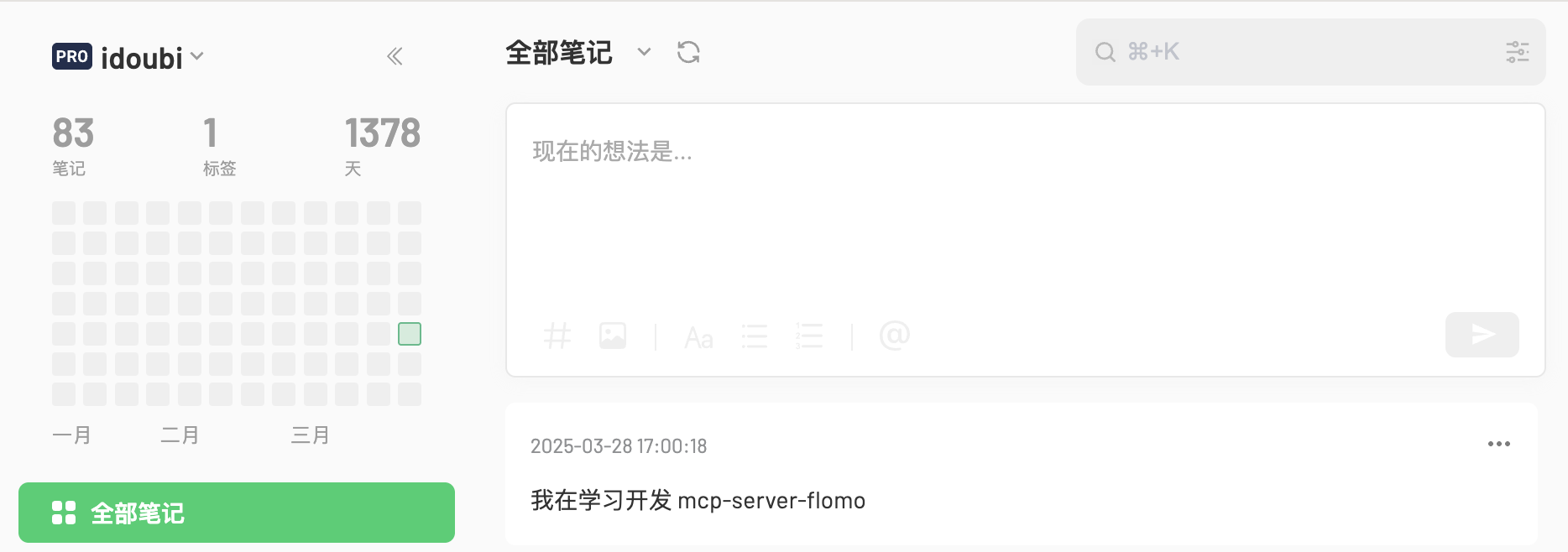curl -X POST https://flomoapp.com/iwh/MTA4MjYz/1b5817dcd3decd55c834249fd9c7f9ae/ \-H 'Content-Type: application/json' \-d '{"content": "从现在开始,我要学习 MCP Server 开发"}'回到 Flomo 笔记列表,已经可以看到刚刚通过终端调用 API 写入的笔记。