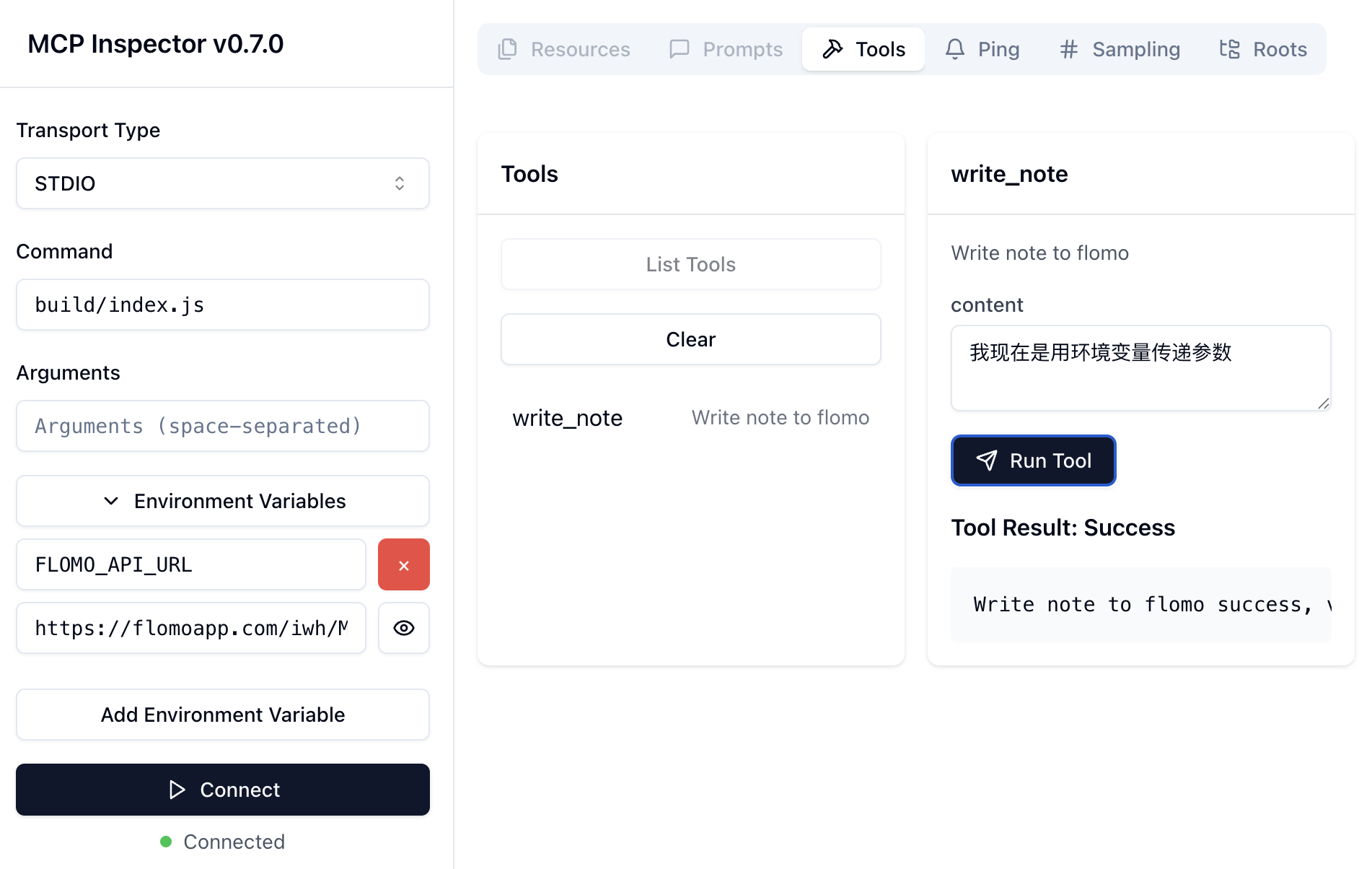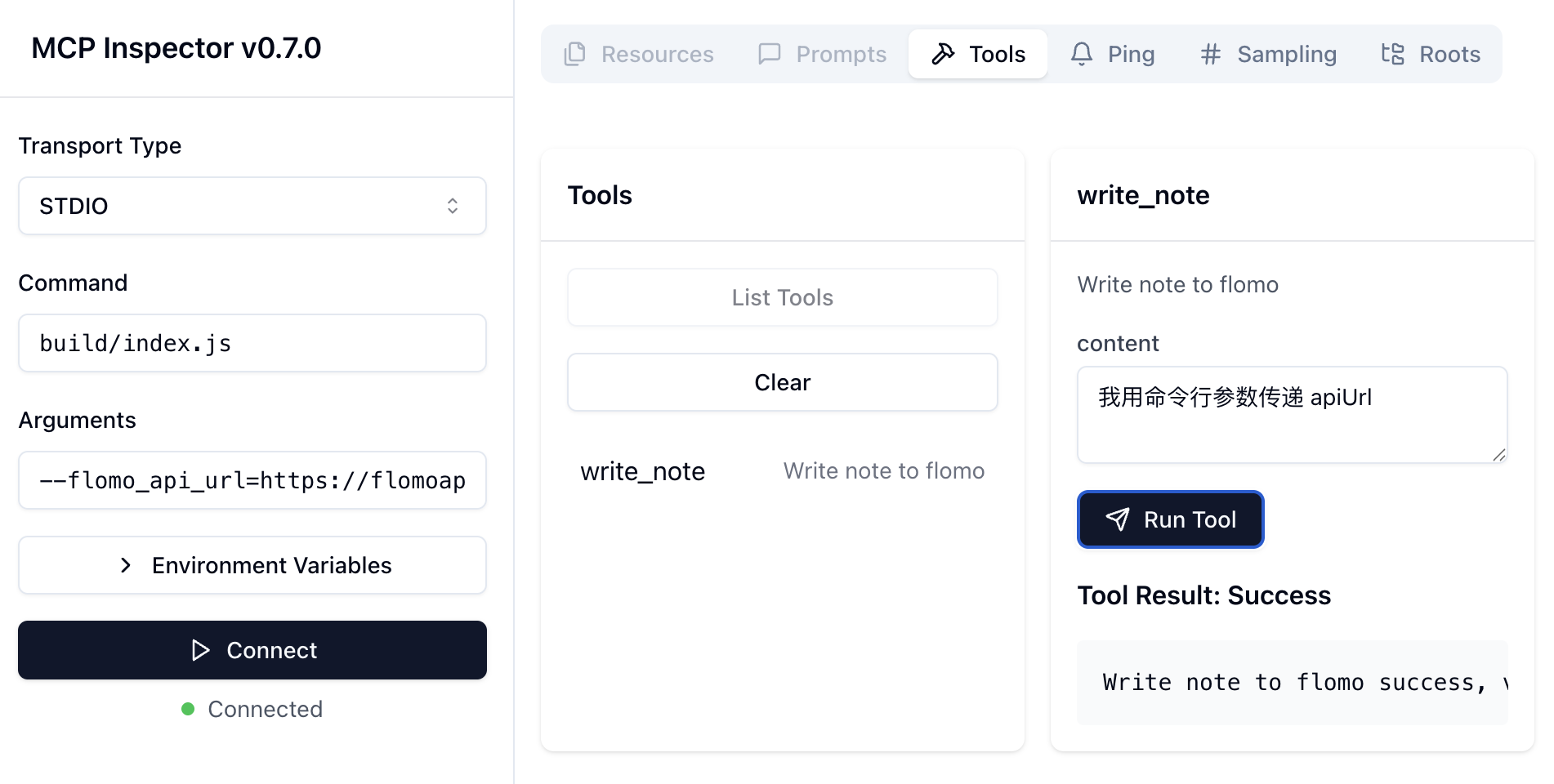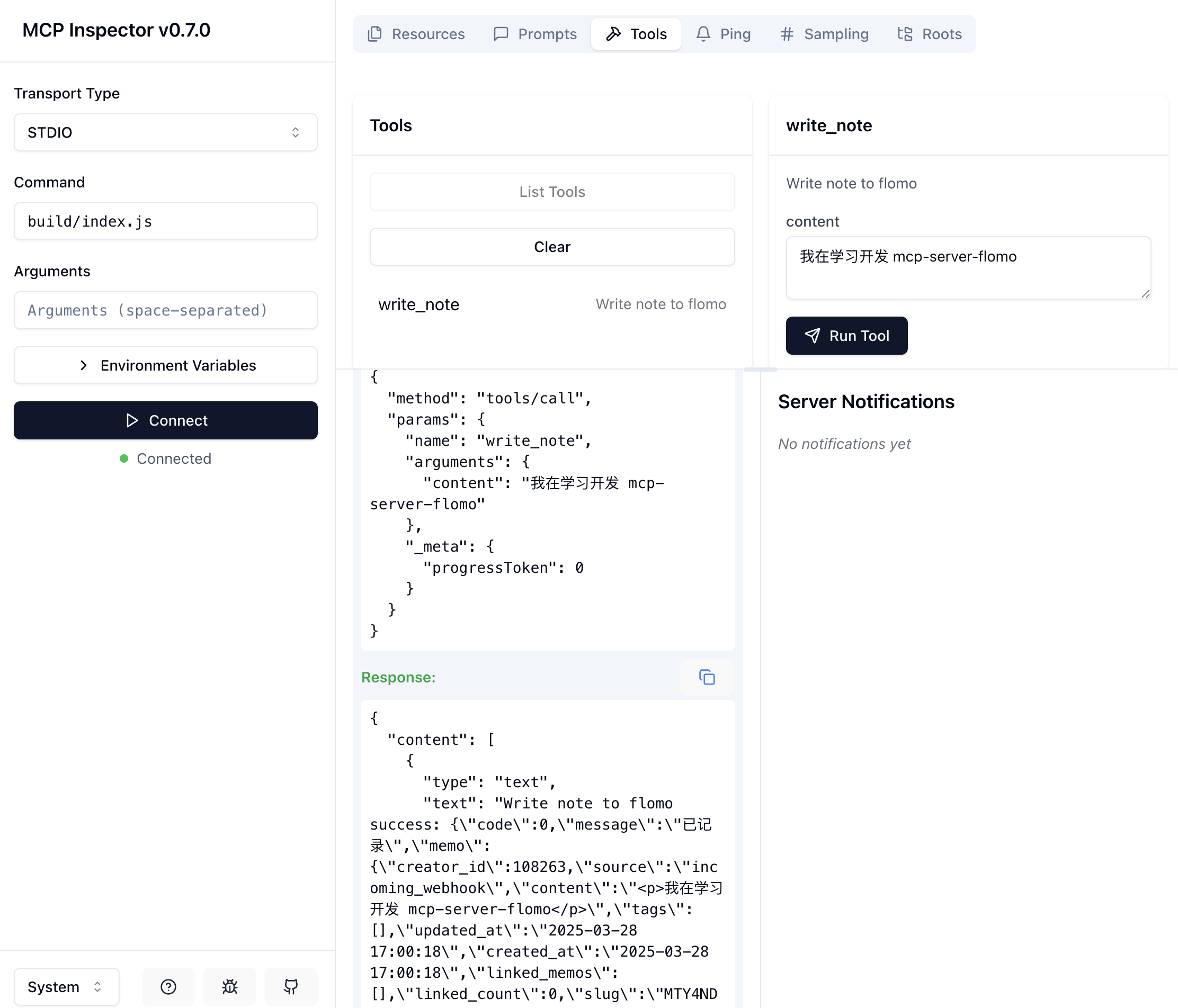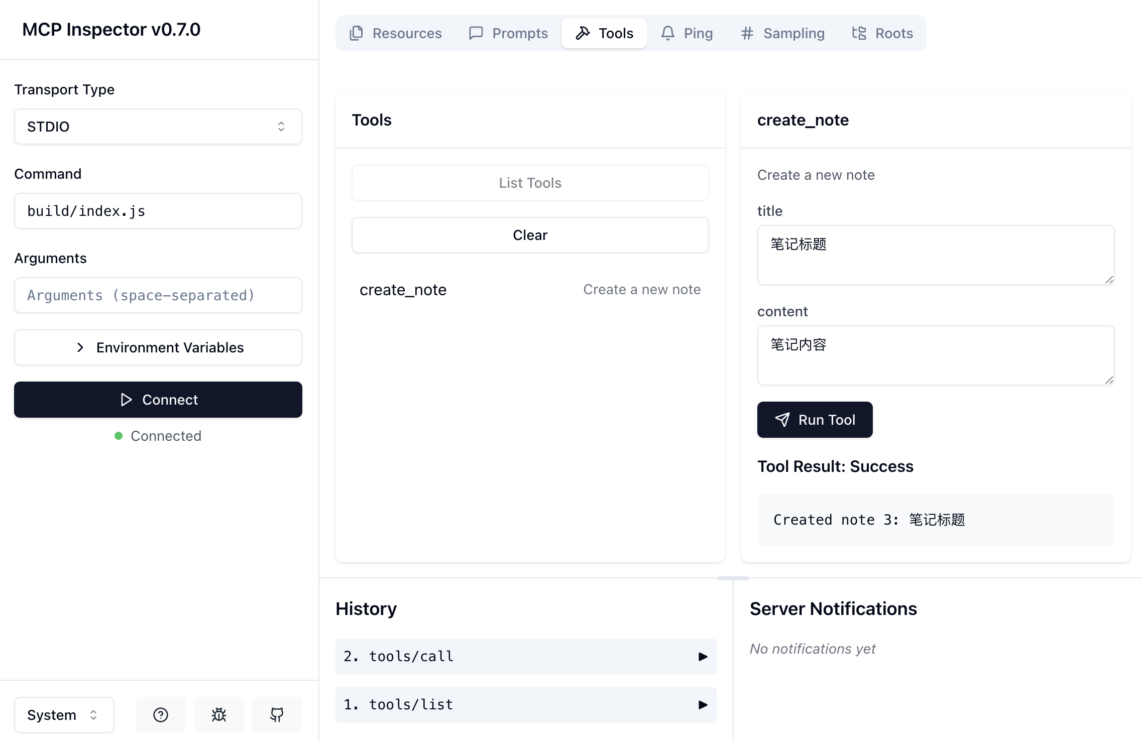 在调试工具选择 write_note 工具,填入 content 参数,点击 Run Tool,查看工具的调用结果: