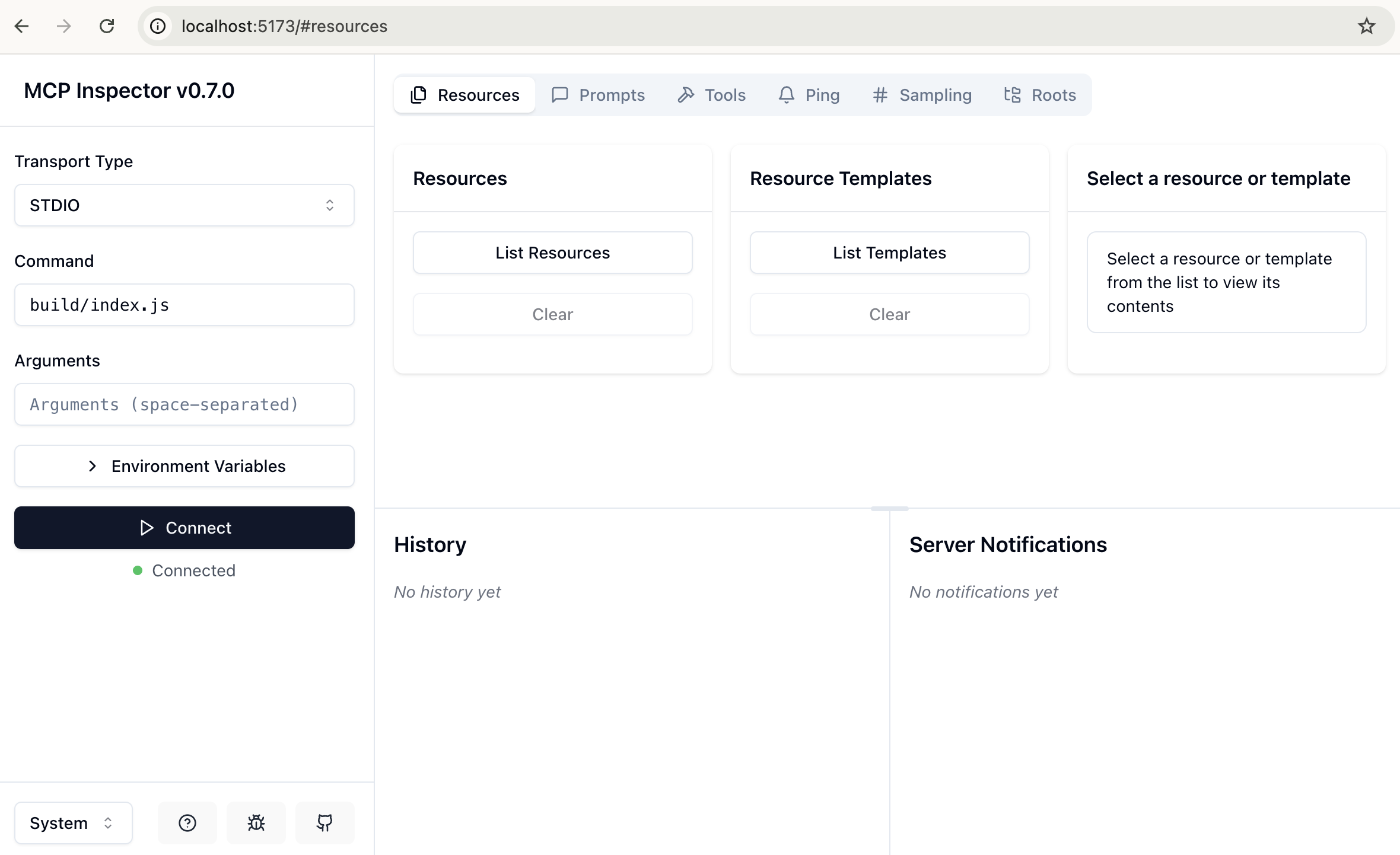 在 MCP 服务器调试面板,点左侧的 Connect 可以连接到 MCP 服务器进行调试,显示 Connected 表示连接成功。