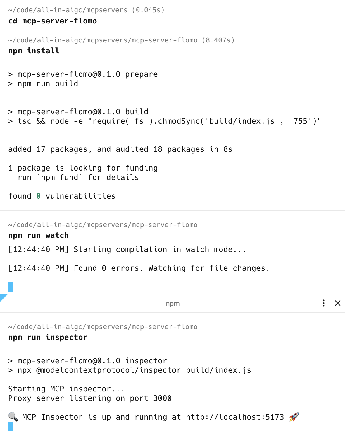 { "name": "@chatmcp/mcp-server-flomo", "version": "0.0.1", "description": "write notes to flomo.", "private": false, "type": "module", "homepage": "https://github.com/chatmcp/mcp-server-flomo", "bin": { "mcp-server-flomo": "./build/index.js" }, "files": ["build"], "scripts": { "build": "tsc && node -e \"require('fs').chmodSync('build/index.js', '755')\"", "prepare": "npm run build", "watch": "tsc --watch", "inspector": "npx @modelcontextprotocol/inspector build/index.js" }, "dependencies": { "@modelcontextprotocol/sdk": "0.6.0" }, "devDependencies": { "@types/node": "^20.11.24", "typescript": "^5.3.3" }}然后,执行命令,发布 npm 包: