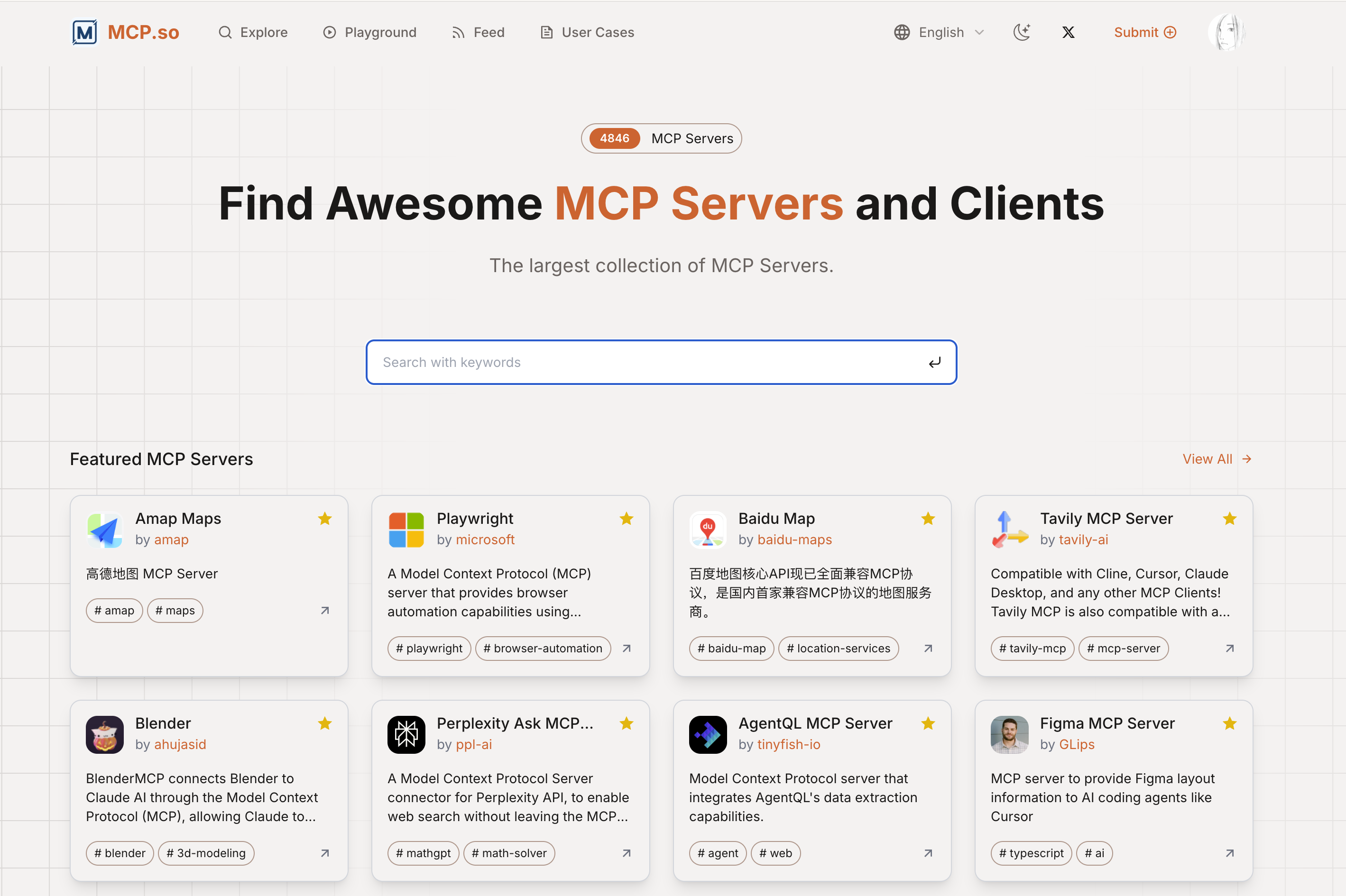MCP.so 是一个知名的第三方 MCP 应用商店,收录了全世界用户开发的优质 MCP 应用。(包括 MCP 服务器和 MCP 客户端)