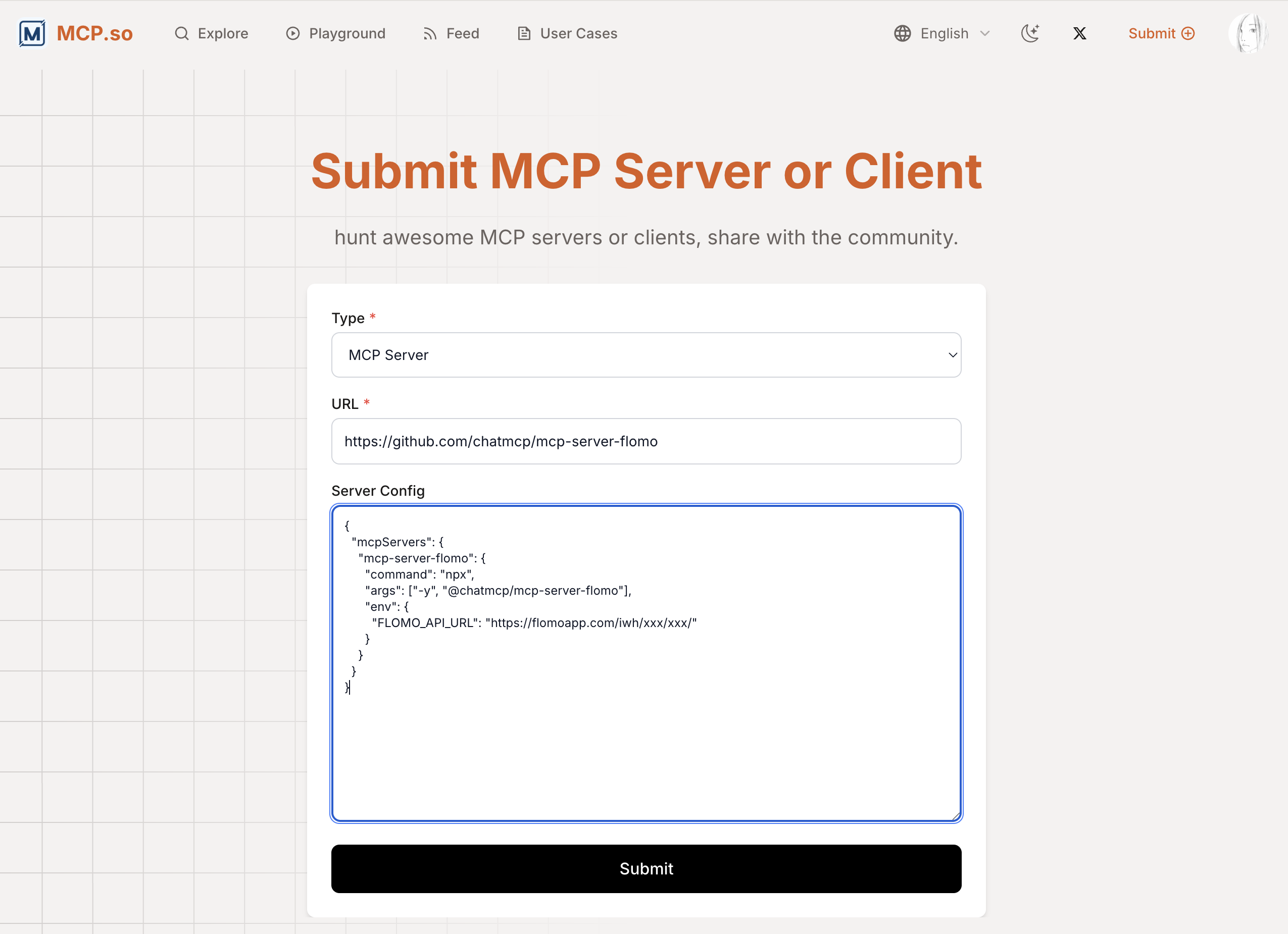 点击进入 Submit 页面,填写我们的 MCP 服务器信息,把服务提交到 MCP.so 应用商店: