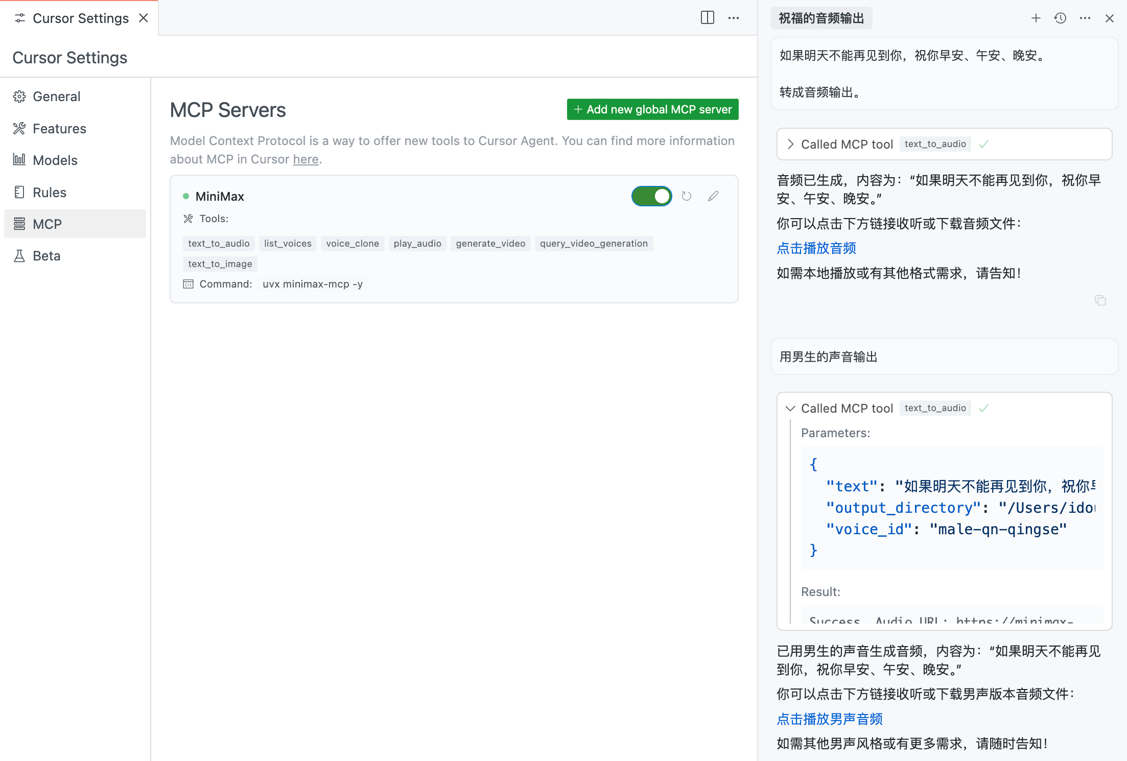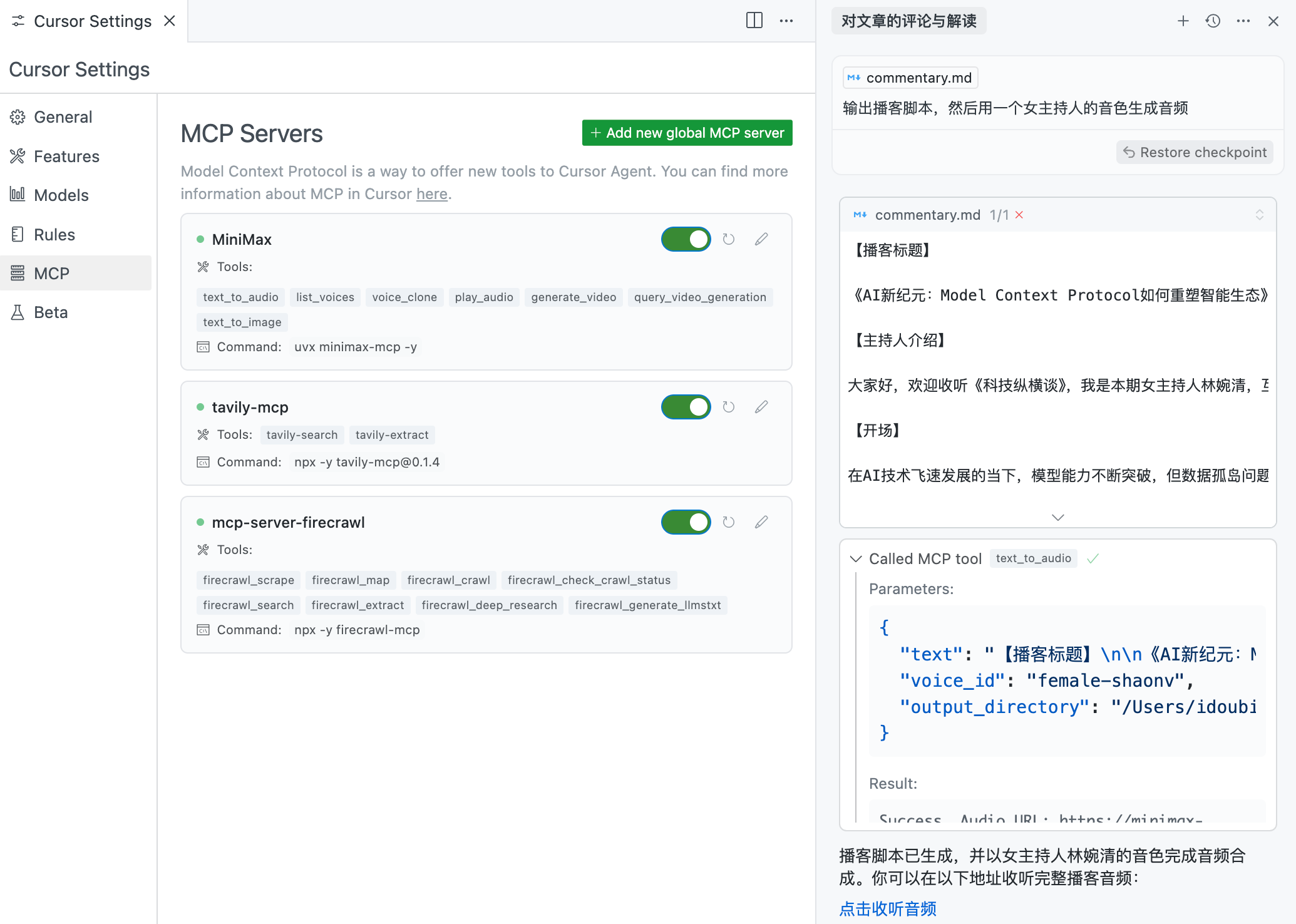 可以看到,Cursor 在请求大模型生成播客脚本之后,调用 MiniMax MCP 服务器的 text_to_audio 工具,把播客脚本转成音频,并把音频的链接回复给了用户。
