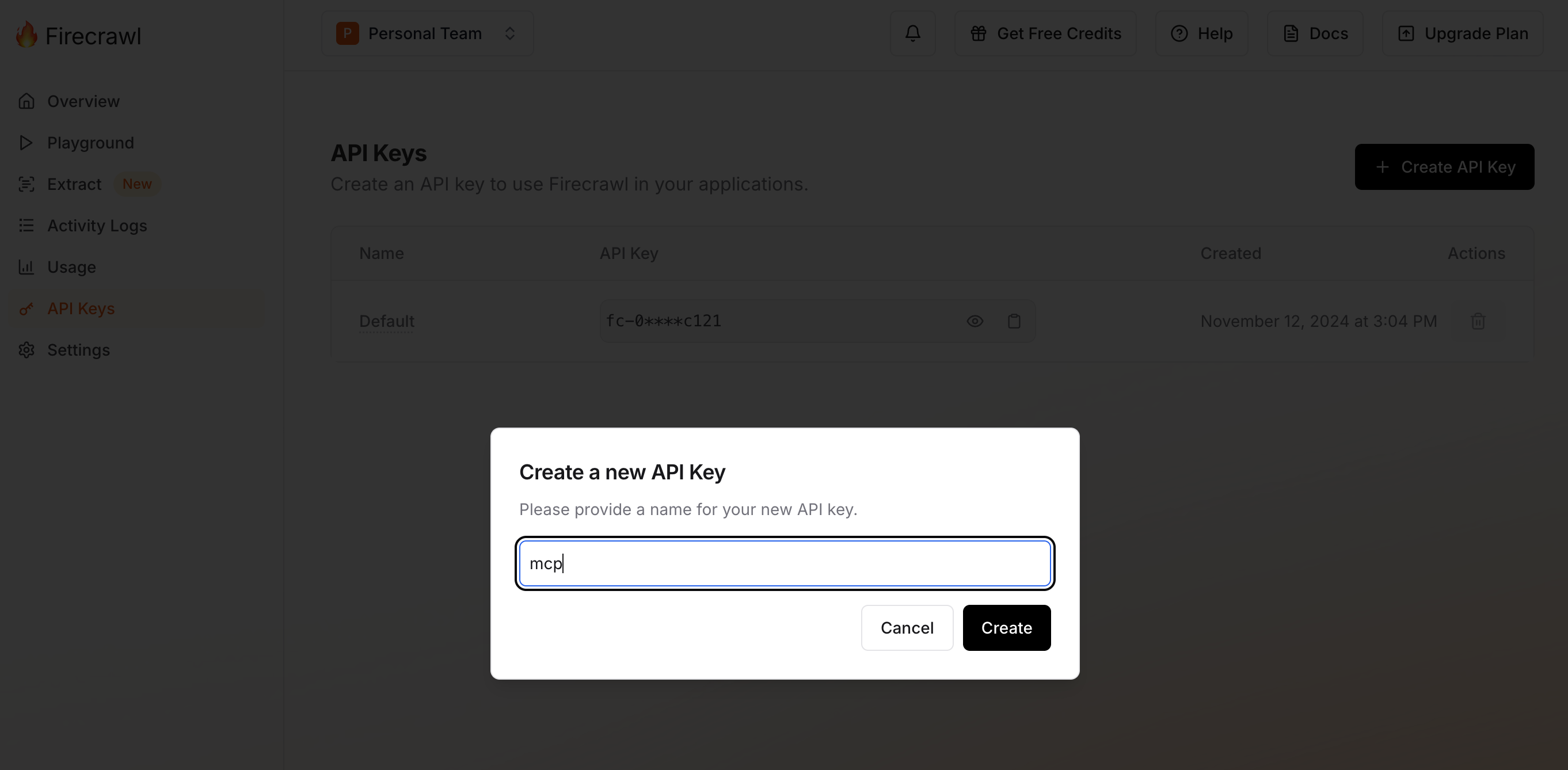 - 在 Firecrawl 管理后台 创建 ApiKey