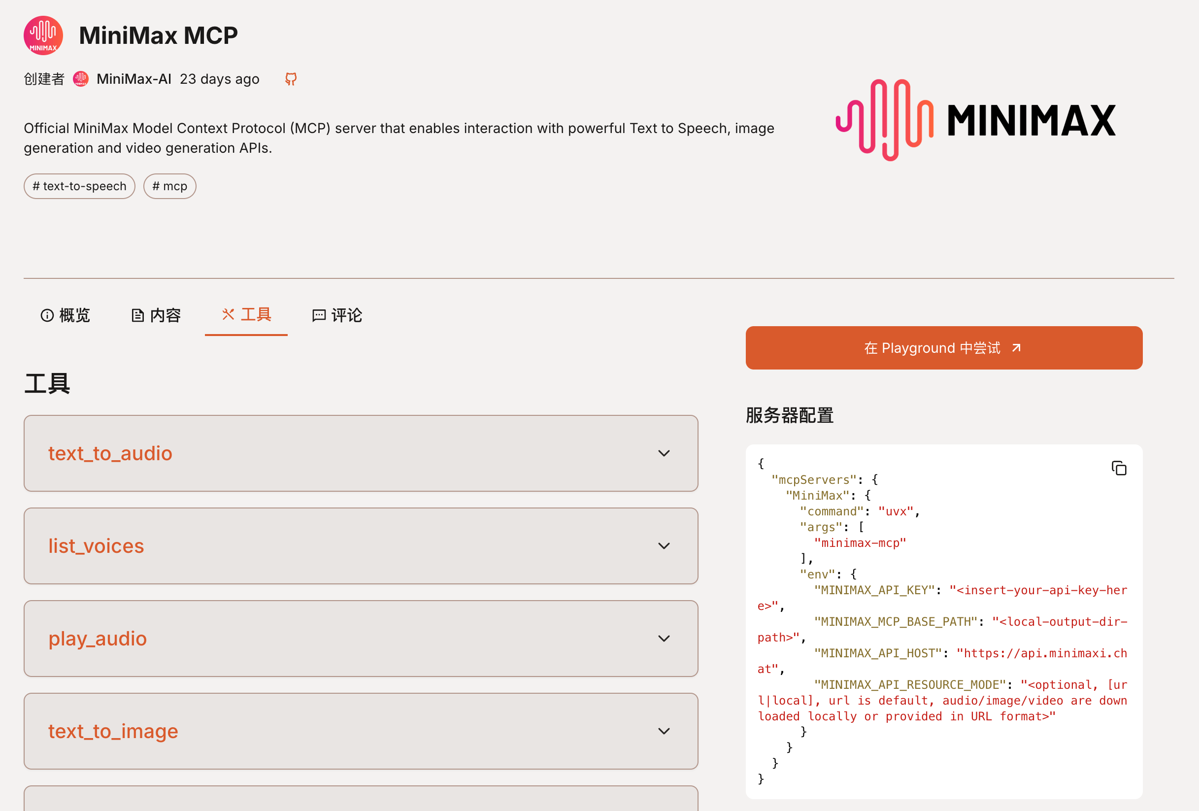 选择国产模型厂商 MiniMax 官方发布的 MCP 服务器,来实现文本转音频的需求。