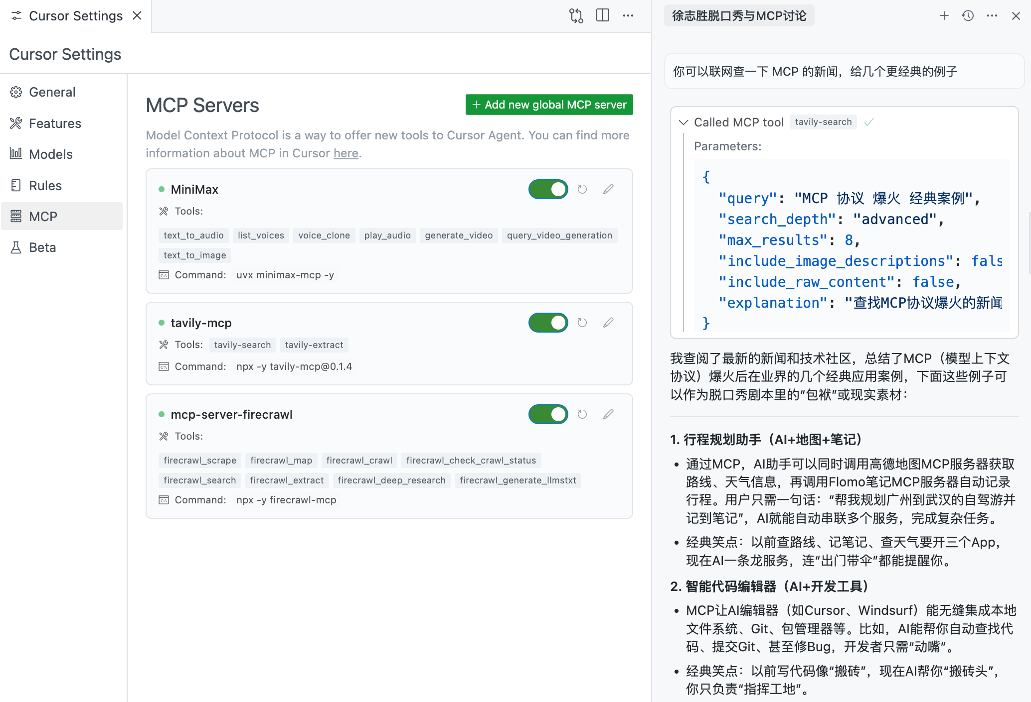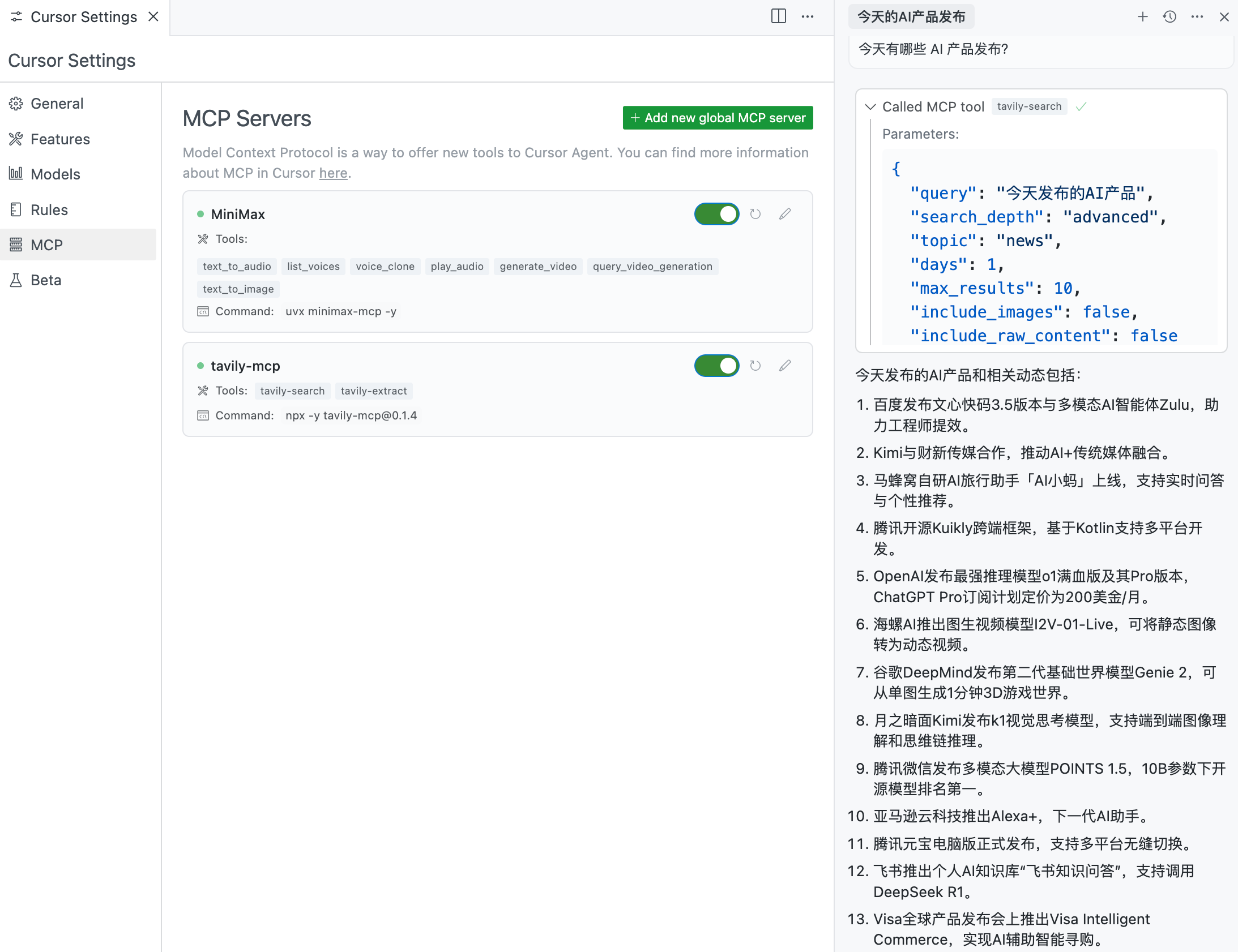 Cursor 接到请求后,调用 Tavily MCP 服务器联网搜索,获取了互联网上跟给定话题相关的信息,如图所示:
