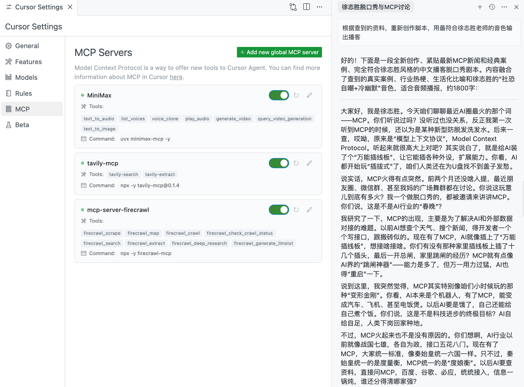 我们使用 Cursor 作为大模型客户端,配置了上述的几个 MCP 服务器,集成了 MCP 服务器提供的诸多工具。通过大模型调度工具、客户端执行工具的方式,使用 MCP 服务器扩展了大模型原有的能力,实现了生成 AI 播客的需求。