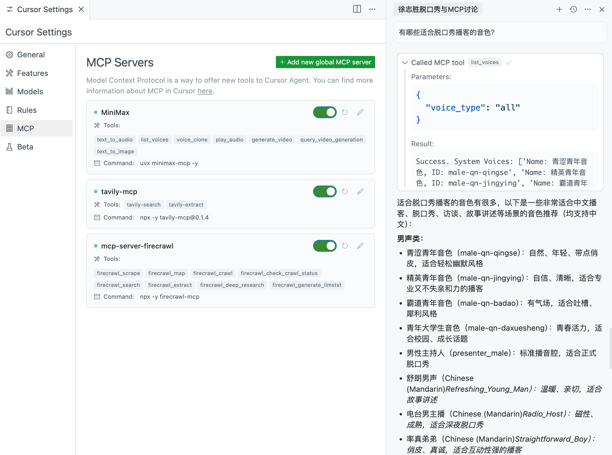Cursor 在接到请求后,调用 MiniMax MCP 服务器的 list_voices 工具,查询了所有可用的音色,如图所示: