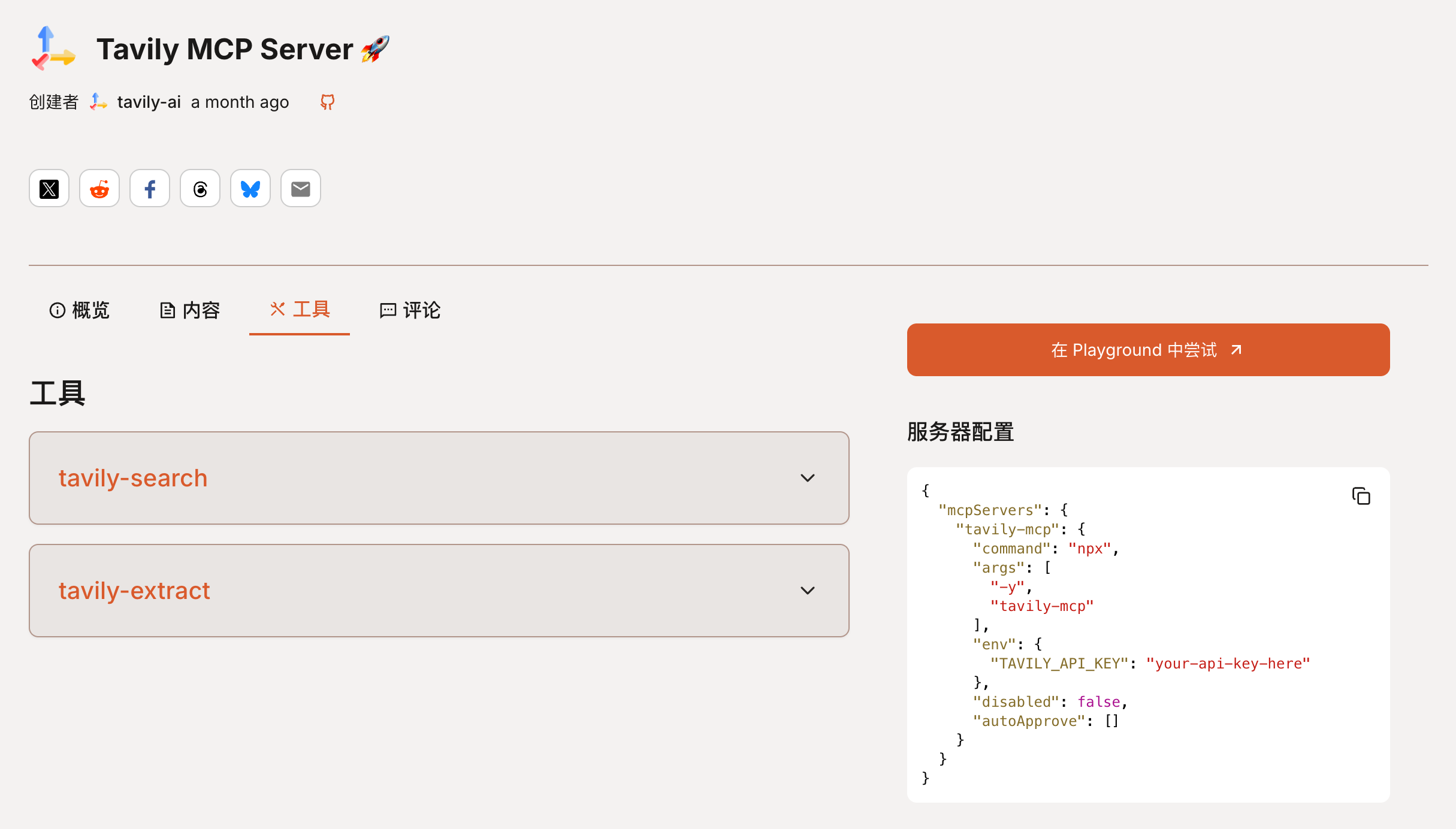 其中的 tavily-search 工具是我们本次需求需要用到的。