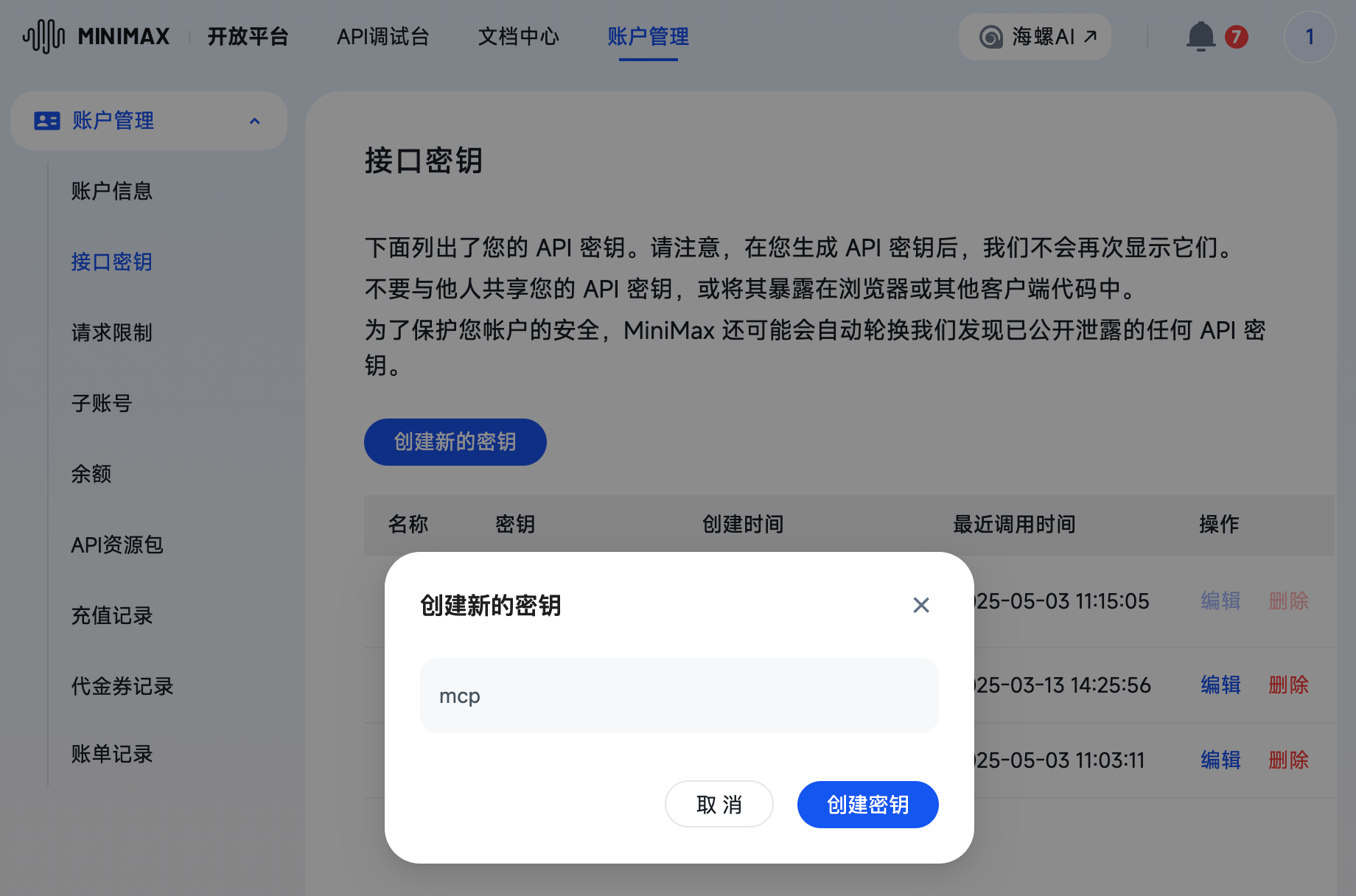 - 在 MiniMax 账户管理中心 创建接口密钥