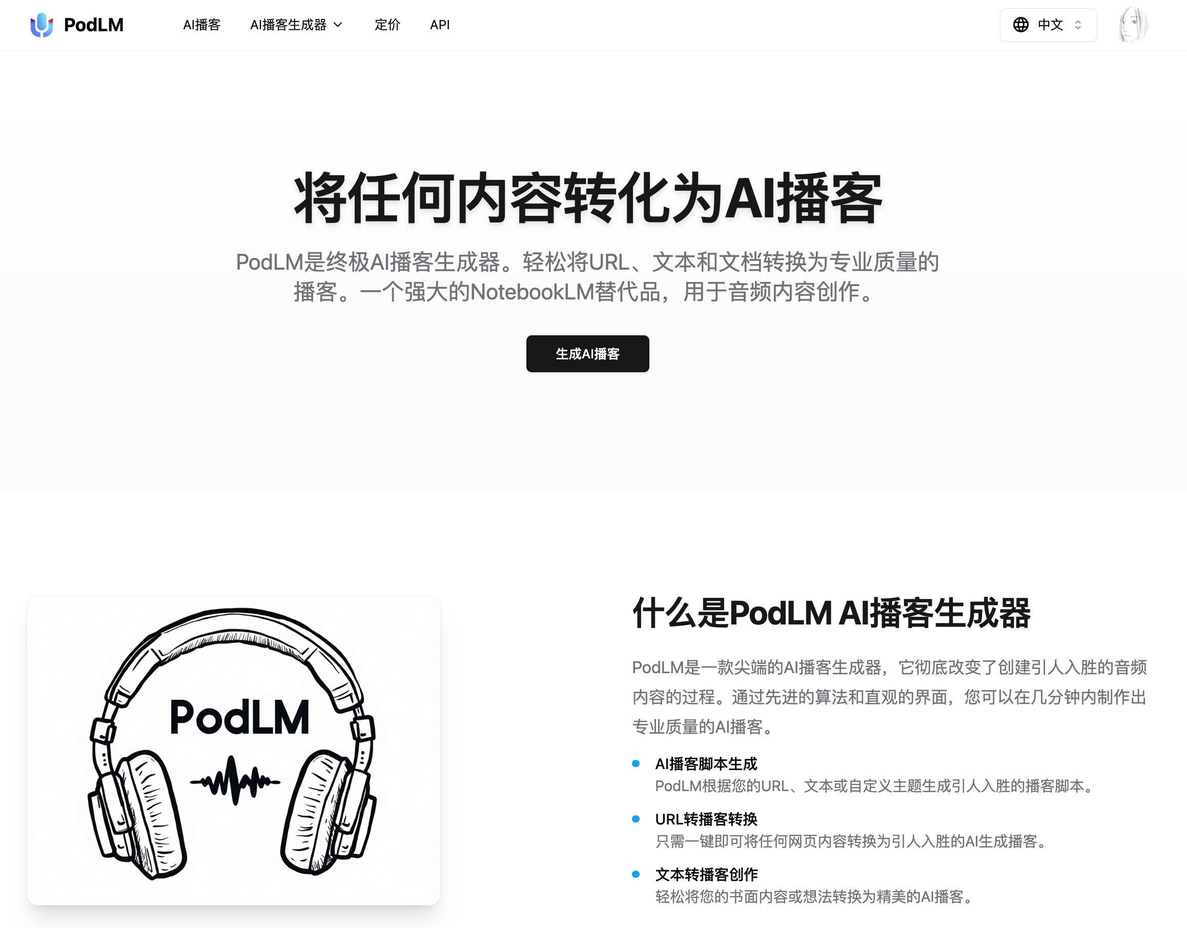 PodLM 是我在 2024 年 10 月开发的一款产品,定位是“AI 播客生成器”,核心功能是根据用户输入的网址或话题,生成一段多人对话的音频,以播客的形式输出。PodLM 产品官网如图所示: